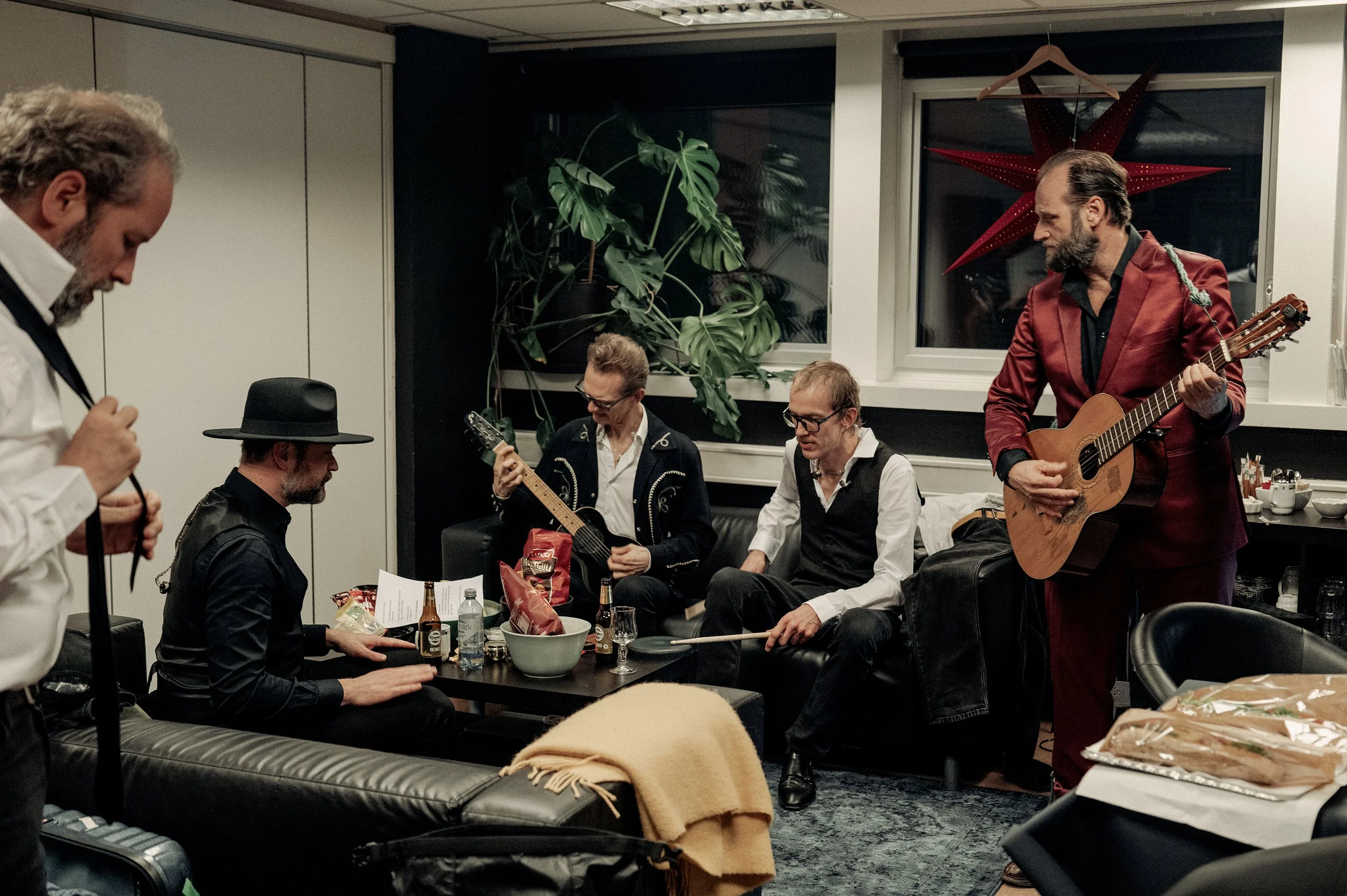 Her er foto frå Notodden Blues i 2025. Tatt av fotograf Marthe Amanda Vannebo. Eg syns serien så godt syner livelivet vårt, før og under og etter gig.